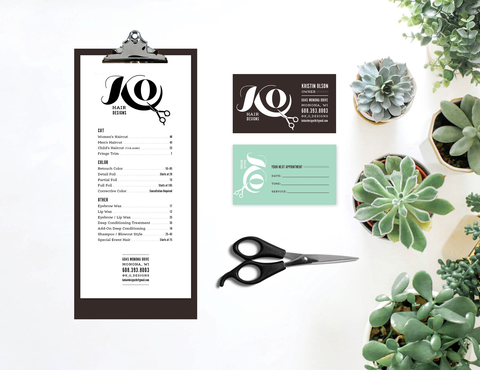 KO Hair Designs needed a fresh brand as the owner, Kristin Olson, opened her own salon after many years of working for someone else. The result was a bold, fresh logo with pops of color throughout the brand.