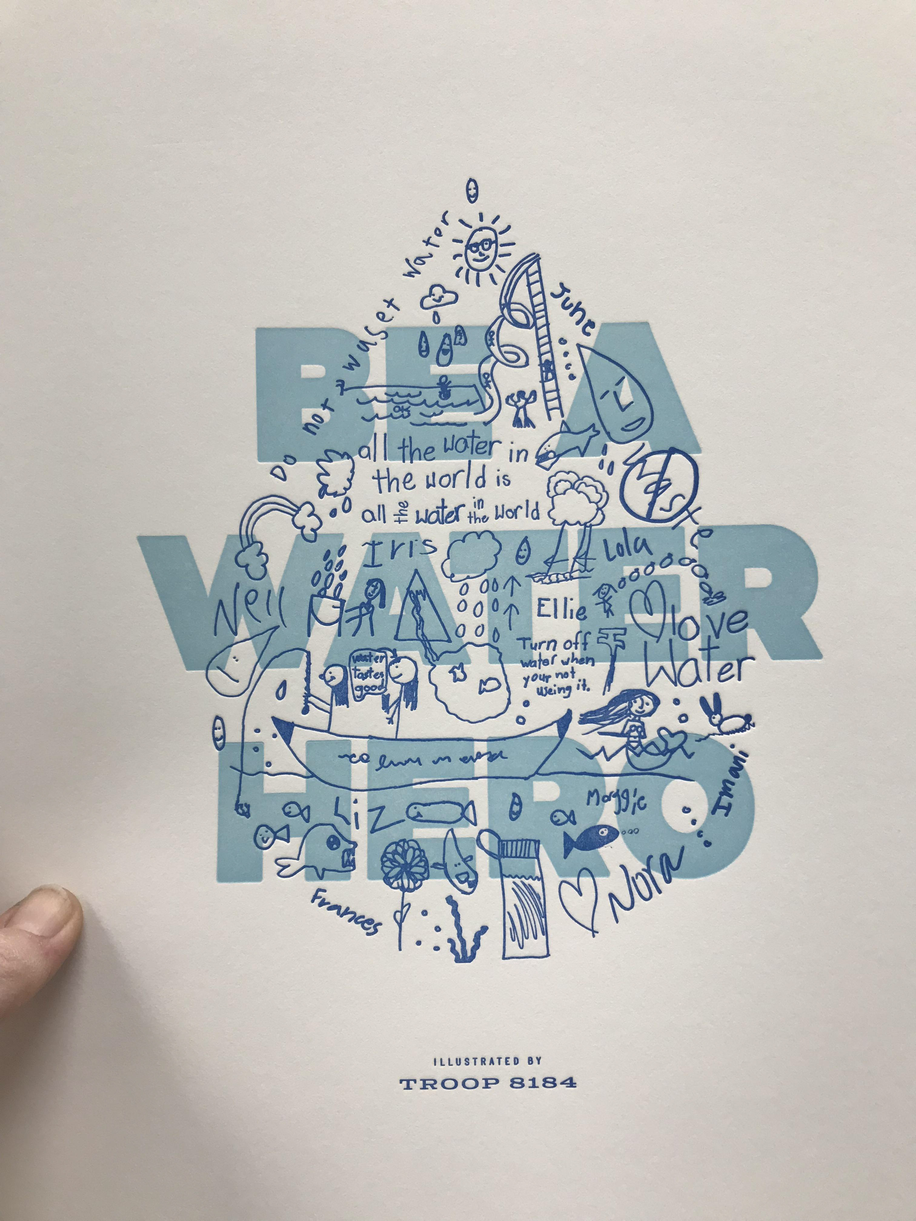 My daughter's Brownie troop was learning about water. I helped them clarify all they learned throughout the process in a letter pressed poster that they could be proud to share with others. They all created their own artwork which I scaled and composed into a water drop. Lead Feather Press lead a wonderful workshop where the girls were able to get hands on with the old-fashioned process of letterpress printing.